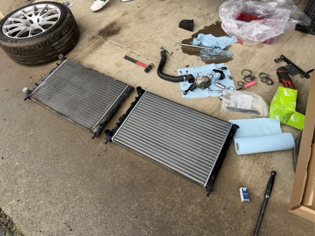 サーモハウジング交換が終わったので、ここから再びラジエーター作業に戻ります。